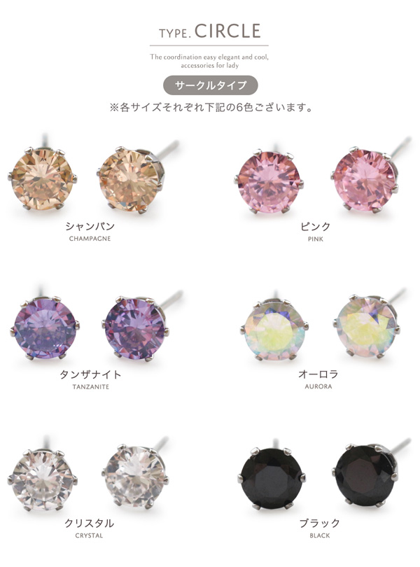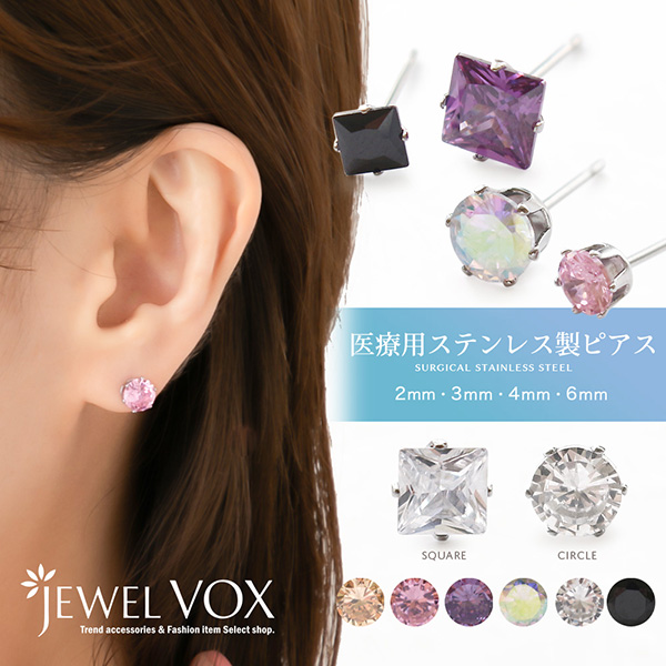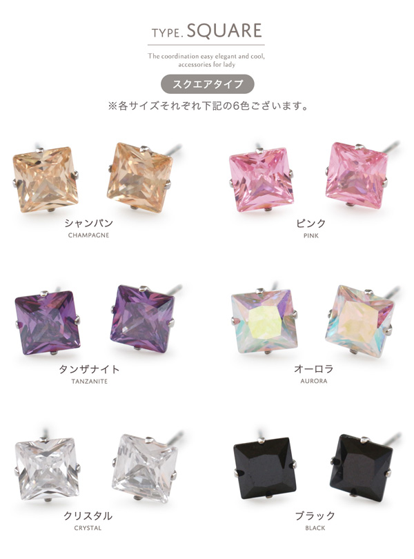 | キラキラと煌めくキュービックジルコニアのお肌に優しい医療用ステンレス製(サージカルステンレス316L)のピアスです。 さりげなくも美しい輝きを放つラウンドカットの「サークルタイプ」とプリンセスカットを施した「スクエアタイプ」の2種類で各6色から選べるラインナップ。 シンプルで使いやすく、デイリー使いからフォーマルなシーンまで幅広く活躍してくれます。 金属アレルギーを起こしにくく、お肌に優しいサージカルステンレスは、サビや変色にも強く、丈夫で優れた長所があります。 JIS規格で「316L」と呼ばれ、アレルギーを引き起こす可能性が極めて低く、医療用器具にも使用されている素材 なので、安心してお使いいただけます。 | |