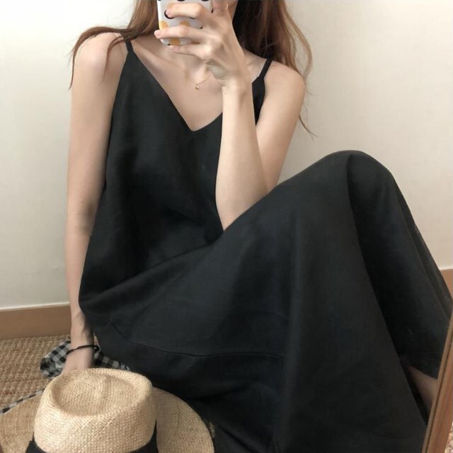 LAZA [ブラック] レディース リネン ロング キャミ ワンピース ノースリーブ マキシ丈 無地 セクシー ゆったり 体型カバー ドレス