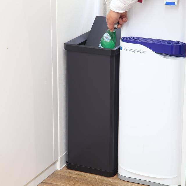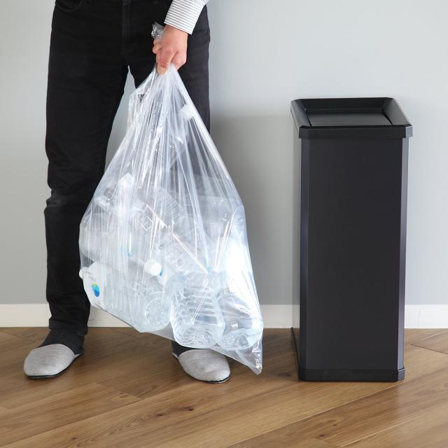 スリムで大きすぎないサイズ感なので使い勝手も良く、省スペースで置けるのでスッキリします。2Lのペットボトルを潰さずに入れると約11本捨てることができます。