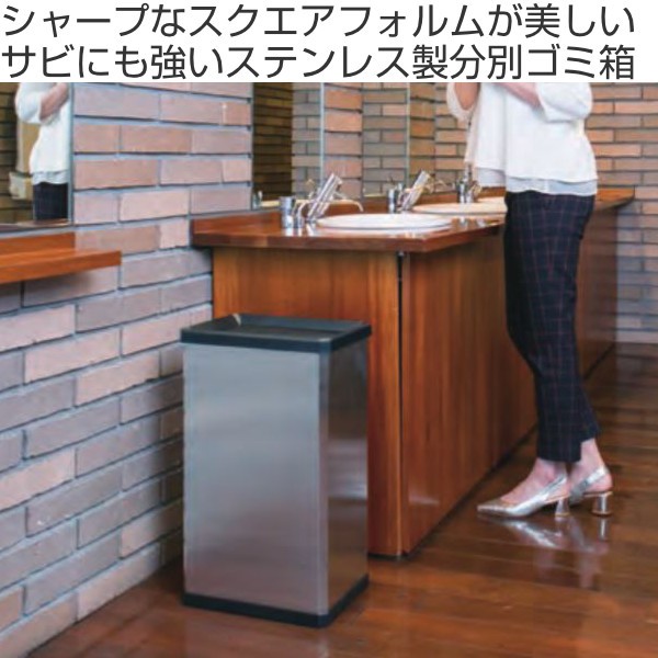 シャープなスクエアフォルムと美しいステンレスのコンビネーションが、スタイリッシュなゴミ箱です。落ち着いた上質な雰囲気が、設置場所を選ばず、様々な施設にマッチします。ステンレス製のため、サビにも強く、水回りにも使用できます。