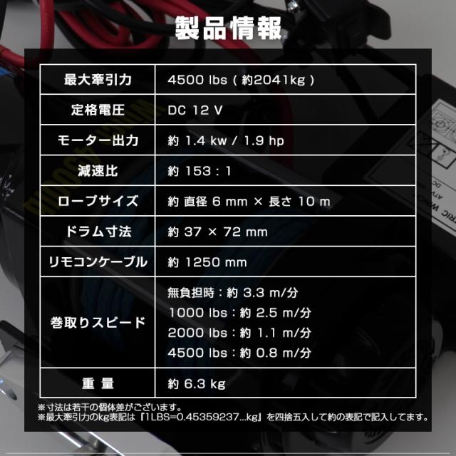 電動ウインチ 12v 4500LBS 2041kg 電動ホイスト 電動 ウインチ ロープタイプ オフロード車 トラック SUV車(ZeepやFJクルーザー等) 防水 DC12V 強力 ハイパワー 車 カー 電源 ホイスト 電動ウィンチ 運搬 引き上げ機 牽引 けん引