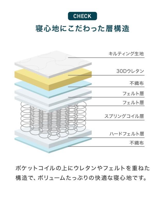 | 素材 | ボンネルコイル、高密度ウレタン(密度30D)、ハードフェルト、パイル生地 他 |