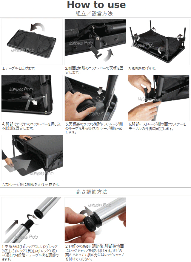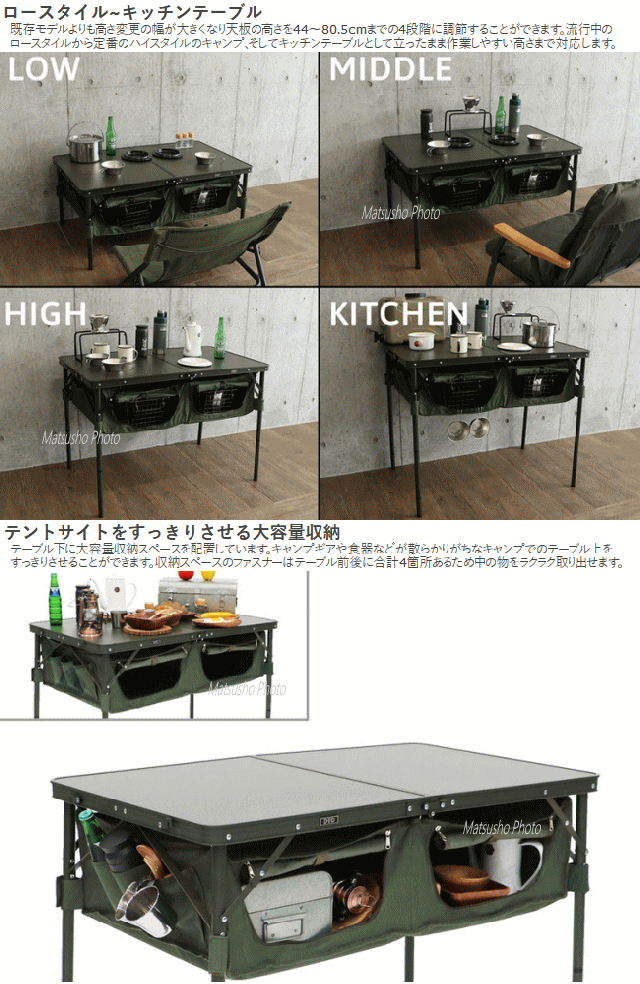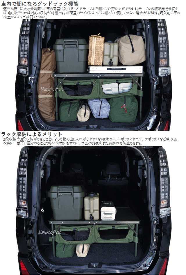 ![]() 車の荷室に棚をつくる。キャンプの収納を手助けする折りたたみテーブル。 テーブル下に大容量収納スペースを備えたアウトドアテーブル。 そのまま車の荷室に入れれば便利な3段収納の棚として使用できます。 キャンプ時にも散らかりがちなキャンプギアや小物を収納すればテントサイトをすっきりと 片付ける事が可能です。 ![]() ![]() ![]() ![]() ![]() | ||||||||||||||||||