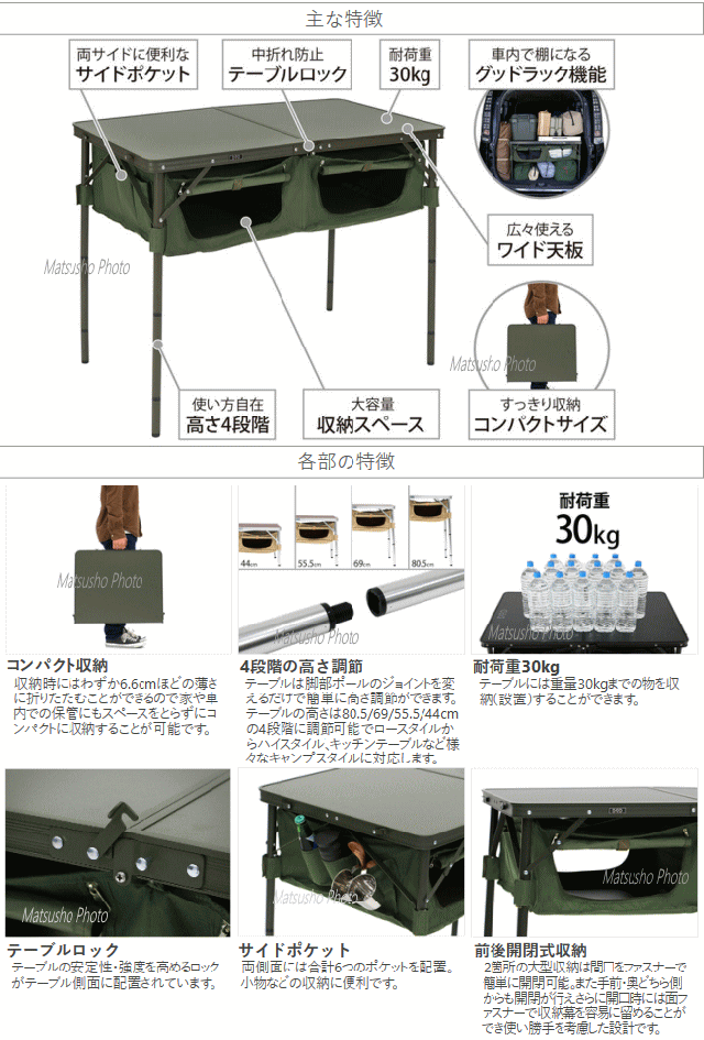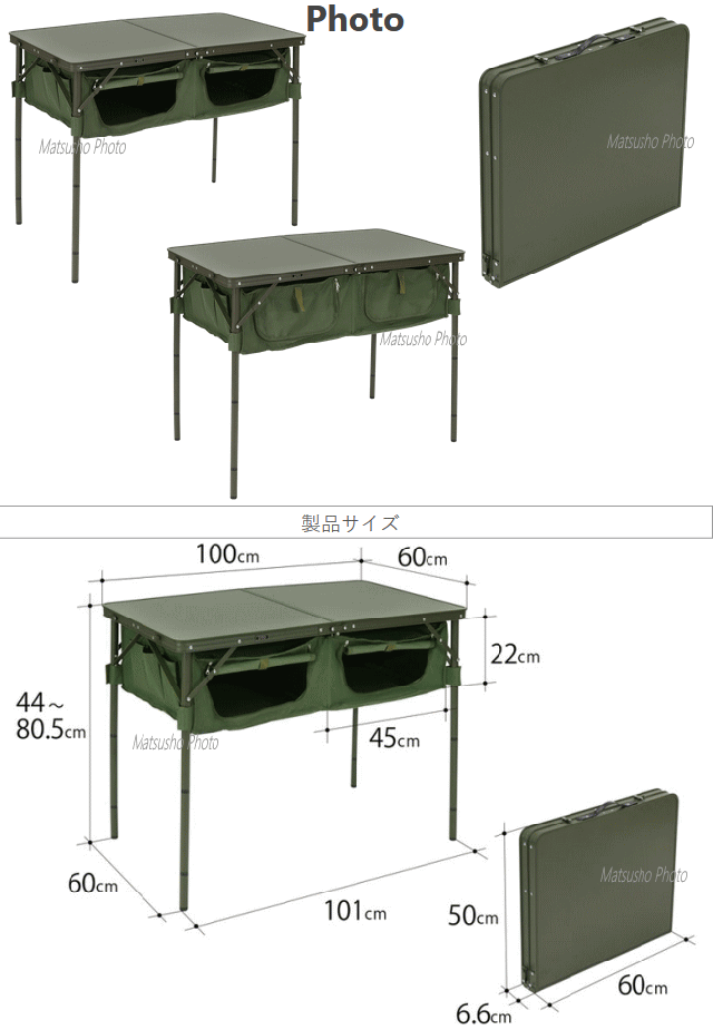 テーブル下に大容量収納スペースを備えたアウトドアテーブル。そのまま車の荷室に入れれば便利な3段収納の棚として使用できます。キャンプ時にも散らかりがちなキャンプギアや小物を収納すればテントサイトをすっきりと片付ける事が可能です。■カラー:カーキ■サイズW60×D100×H80.5/69/55.5/44cm■収納サイズ約W60×D50×H6.6cm■重量約6.1kg(付属品含む)■静止耐荷重[天板部分]30kg[ストレージ部分]5kg■材質[フレーム]アルミ合金[生地部分]ポリエステル[天板・棚]MDF■セット内容:テーブル、ストレージ棚、棚板×2枚、レッグ(長)×4本、レッグ(短)×4本、レッグキャップ×4個※荷室のサイズによっては棚として使用できない場合や横向きに収納できない場合があります。購入前に車の荷室サイズをご確認下さい。一部画像に同構造の別型番のものを使用しています。2021年3月出荷分よりファスナーなど細かいパーツのカラーや構造を若干仕様変更しており一部画像に仕様変更前のモデルを使用しております。【大型商品のため同梱発送不可】
