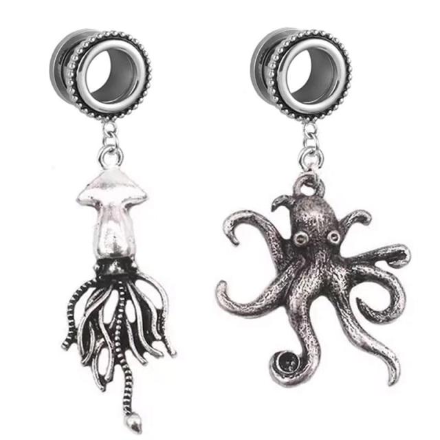 クラーケンをイメージさせる大きな烏賊と大きな蛸(オクトパス)のチャームが揺れるトンネル型ボディーピアス。