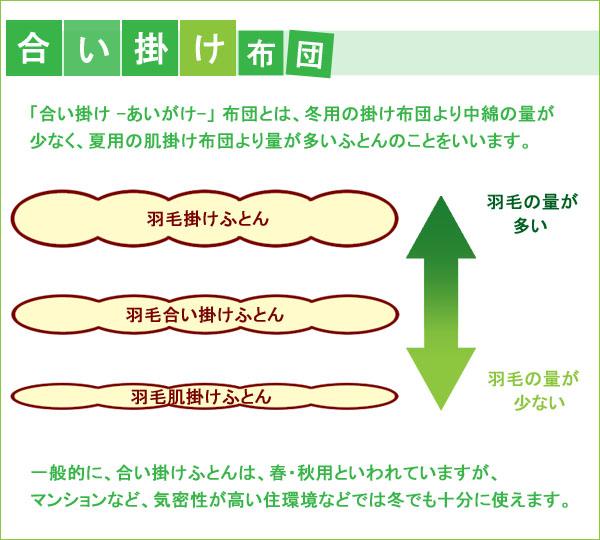 合掛けふとんは、通常の羽毛掛ふとんより少しボリュームを抑え薄めに仕上げた合い布団(あいぶとん)。