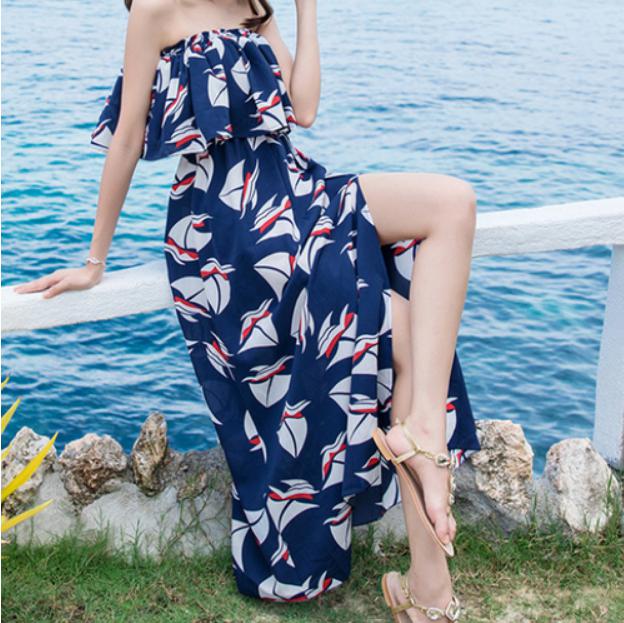 LAZA 夏 ヨット柄 紺 ワンピース L オフショル フレア 3WAY マキシワンピ パーティー リゾート 旅行