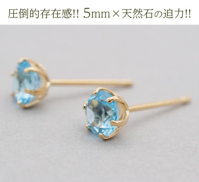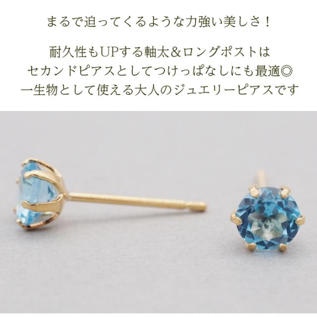 | K18 YG 天然石 ピアス(セカンドピアス) ブルートパーズ 5mm パワーストーン 誕生石 プレゼント 軸太 ロングポスト |