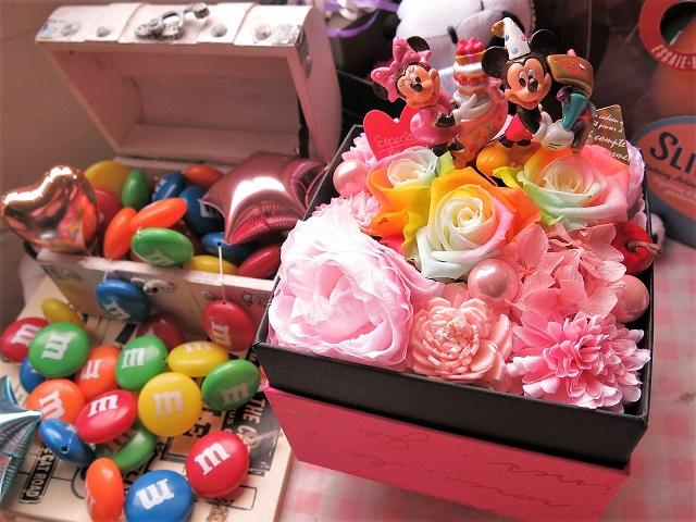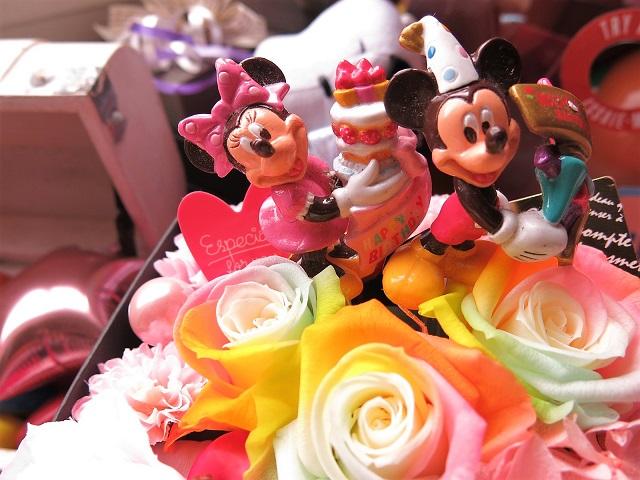 プリザーブドフラワー ディズニー 誕生日プレゼント 花束風 箱開けてスマイル ボックス入り レインボーローズ ミッキー ミニー バースデーB