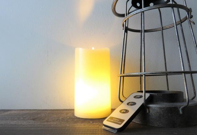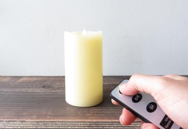 本体の電源を入れると離れていても簡単にキャンドルの灯りをON/OFFさせられるリモコン付き。リモコン操作でタイマー機能もご利用いただけます。 |