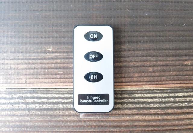 ボタンは3種類のみのシンプルな操作性。「6H」ボタンを押すと「6時間点灯し、18時間後に再点灯」を自動的に繰り返します。リモコンにはボタン電池(CR2025)1個が附属しています。 |