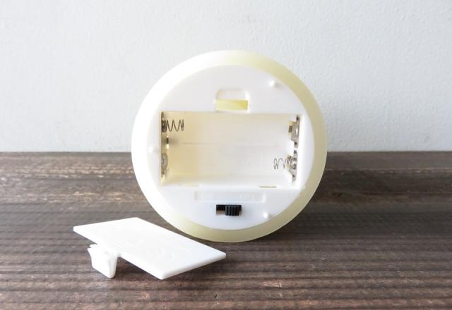 アルカリ単三電池を2本使用した場合に連続点灯約150時間お楽しみ頂けます。本体底部に電源スイッチおよび電池ボックスがございます。(※電池は別売りです、別途ご準備ください) |