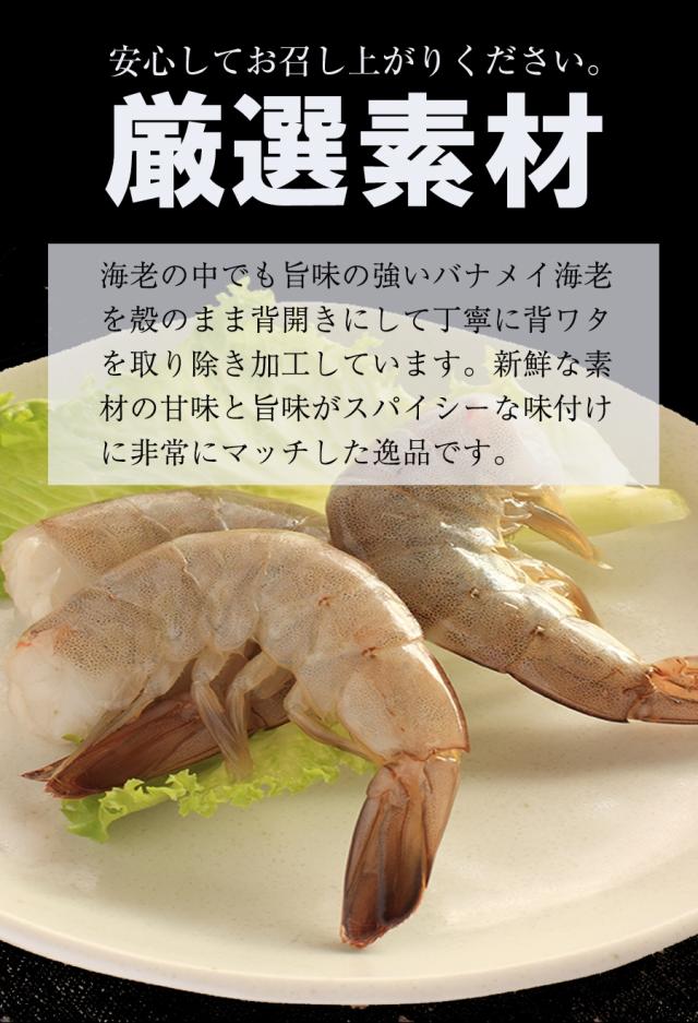 【原材料】バナメイえび(インド産)、調味液(ガーリックパウダー、砂糖、コーンスターチ、食塩、パセリ、ホワイトペッパー)/マルトデキストリン、たんぱく加水分解物、?調整剤(一部にえび・大豆を含む)
