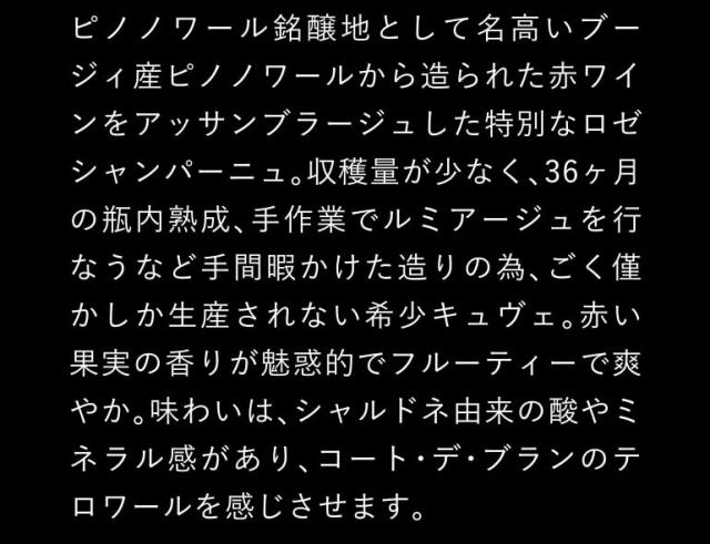 イタリア人がオーナーの珍しいシャンパーニュメゾン。ピノノワールの銘醸地として名高い、ブージィ産ピノノワールによる赤ワインをアッサンブラージュして造られた特別なロゼシャンパーニュ。収穫量が少なく、36ヶ月の瓶内熟成、手作業でルミアージュを行なうなど非常に手間暇かけた造りの為ごくわずかしか生産されていません。赤い果実の香りが魅惑的で、フルーティーで爽やか。味わいはシャルドネ由来の酸、ミネラルを感じる親しみやすいスタイル。シャルドネ95%、ピノノワール5% ドサージュ 3g/L