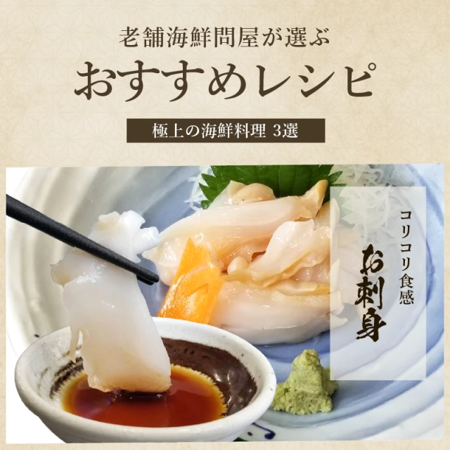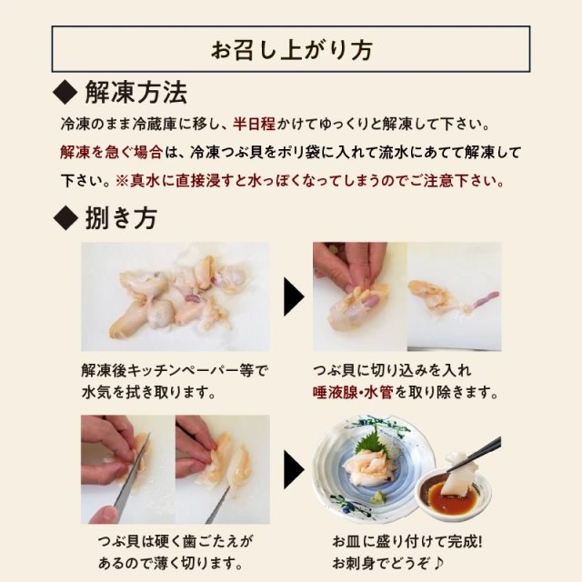 - 既に薄切り加工がされているので、刺身や海鮮丼としてすぐに食べることができ、コリコリ食感で最高です。