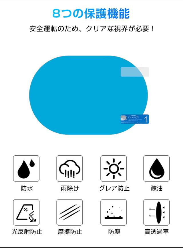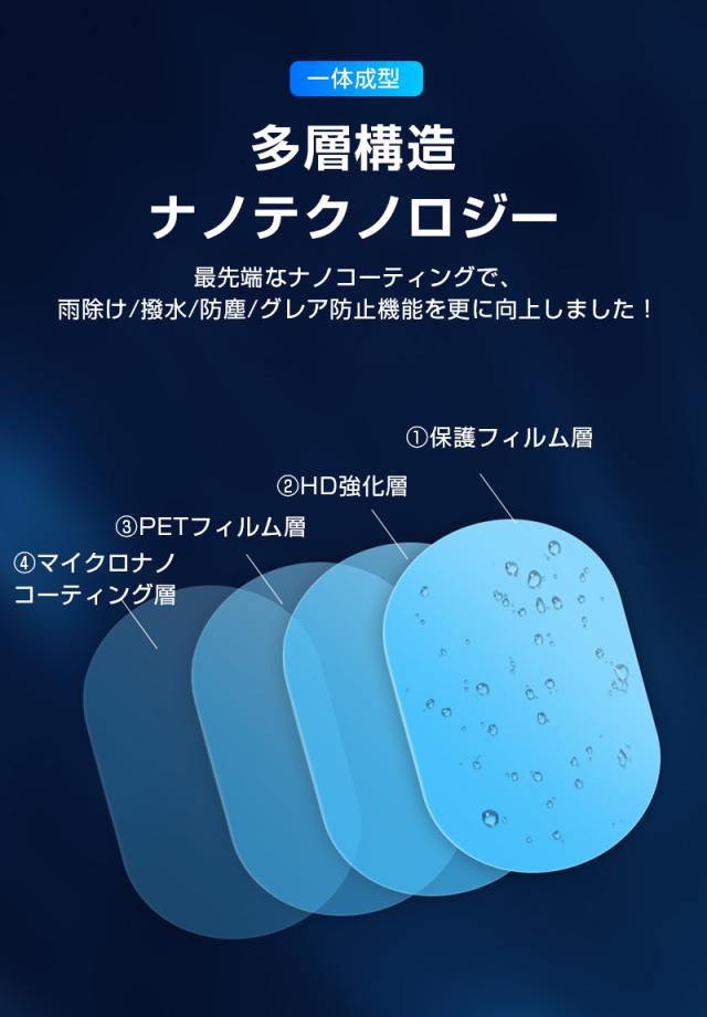 【優れた機能性と多層構造】保護フィルム層/HD強化層/PETフィルム層/マイクロナノコーティング層で一体成型に作られております。ナノコーティングの分子構造は水分子より小さいため、雨などの水分は内部に浸透出来ず、表面でドロップに成形して撥ねられます。防水、疎油、曇り止め、摩擦防止、光反射防止、グレア防止、防塵、高透過率の8つの性能で、スーパークリアな視界を提供し、安全運転をサポートしてくれます。