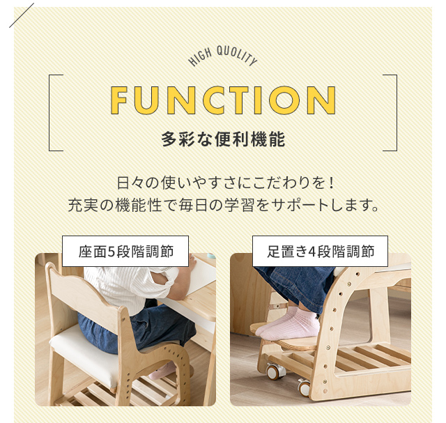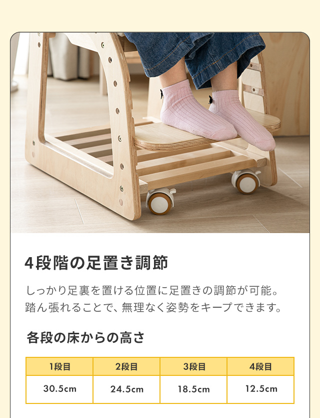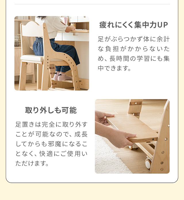 - 椅子と足の高さが調節可能なので6歳でもおばちゃんでもしっかり座れていい感じです。お値段の割にはしっかりしているしで気に入りました。 調節がもう少し楽にできると嬉しいかなと星4つです。