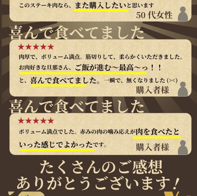 - 違うお店で購入したステーキがとても柔らかくて美味しかったのでこちらもそうなのかな?と思い数を購入。たたきでも食べられると記載あって焼き方も説明がありその通りにしましたがスジがあって噛みきれない部分があ...