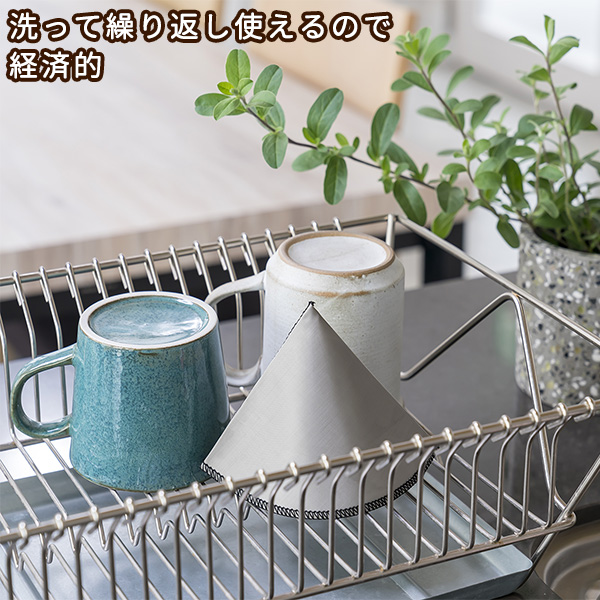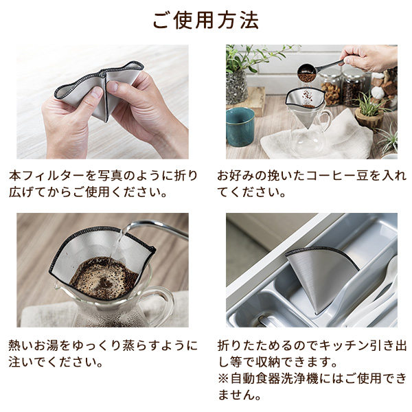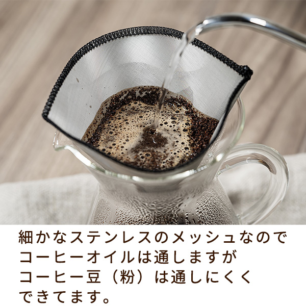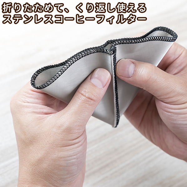 折り畳め、くり返し使えるステンレスコーヒーフィルター。 細かなステンレスのメッシュなのでコーヒーオイルは通し、コーヒー豆(粉)は通しにくくできてます。