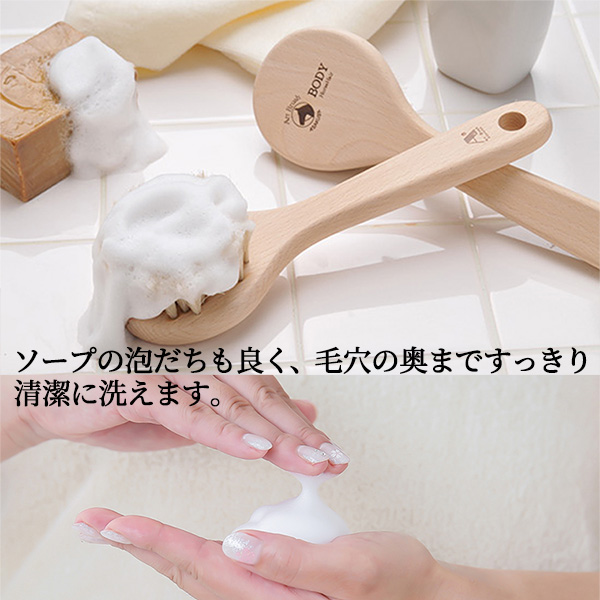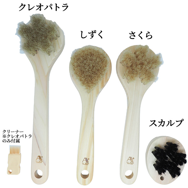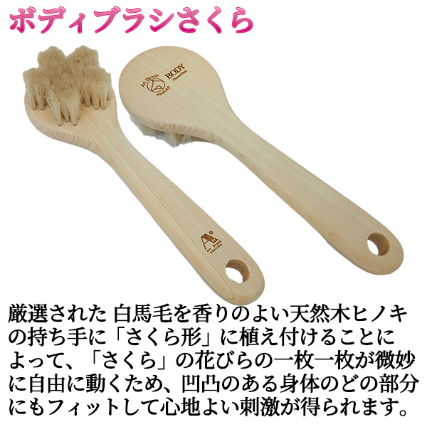 厳選された 白馬毛を香りのよい天然木ひのきの持ち手に「さくら形」に植え付けることによって、「さくら」の花びらの一枚一枚が微妙に自由に動くため、凹凸のある身体のどの部分にもフィットして心地よい刺激と爽やかさ。 ソープの泡だちも良く、毛穴の奥まですっきり清潔に洗えます。