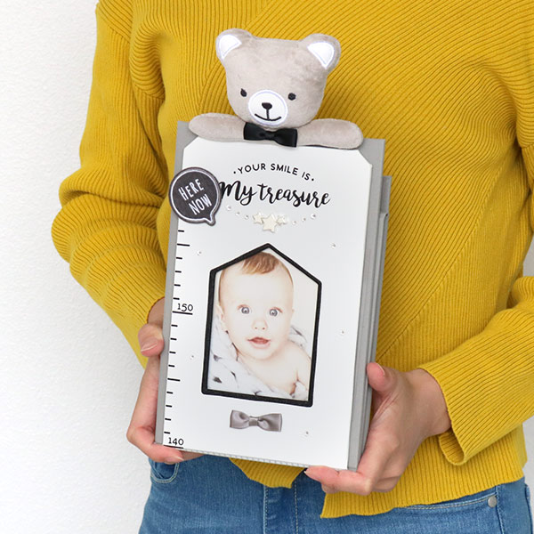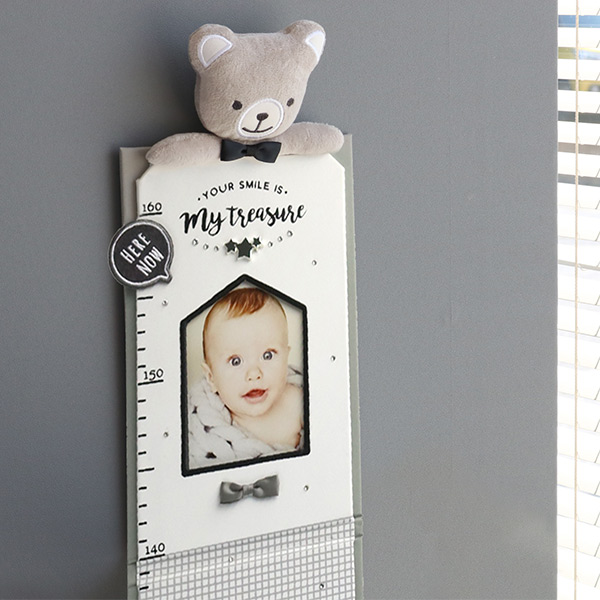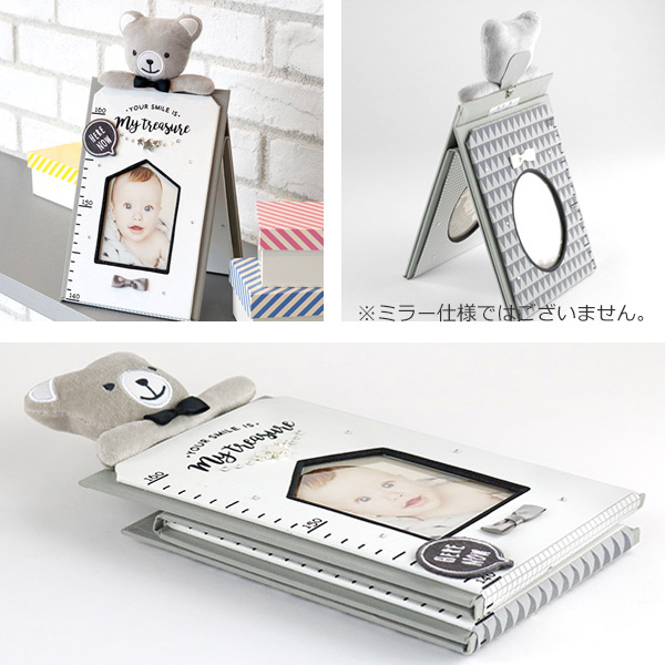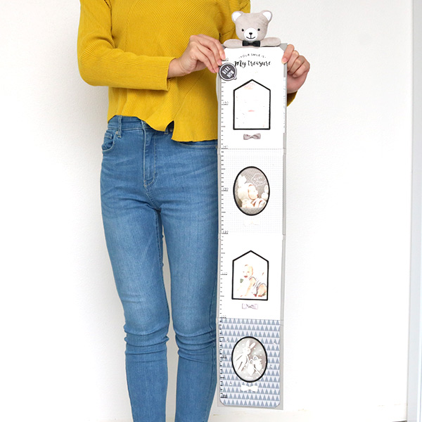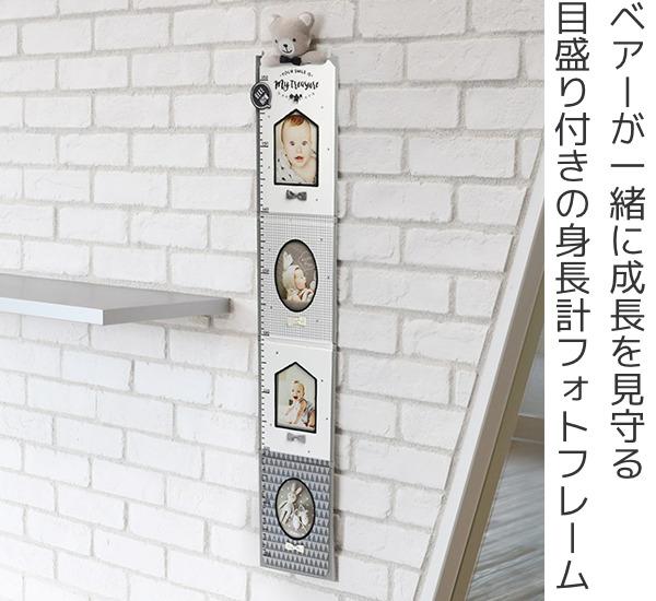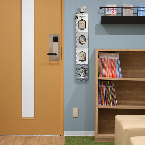 お子様の身長が測れる身長計で、横から写真を入れられます。ふわふわで可愛いベアーが一緒に成長を見守ってくれます。
