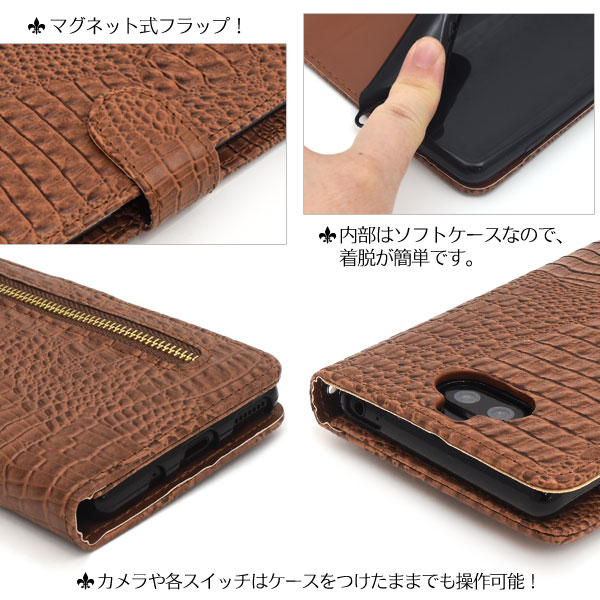 クロコダイルレザーデザインの手帳型ケース。