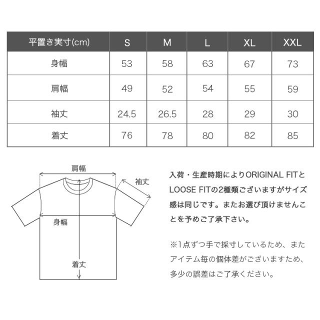 平置き実寸(cm)[身幅/肩幅/袖丈/着丈] S:53/49/24.5/76 M:58/52/26.5/78 L:63/54/28/80 XL:67/55/29/82 XXL:73/59/30/85 ※多少の誤差はご了承ください