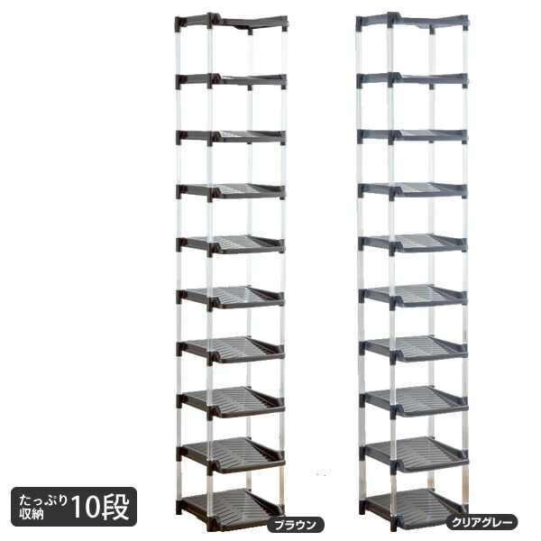 | 商品説明 | ●組み立てカンタンなシューズラック ●空間をタテに使ってたっぷり収納 ●10段としても、5段ずつ別々にも利用可能 ●汚れても洗える樹脂製 ●風通しも良く、濡れたままの靴も気にならないオープンタイプ ●こだわり素材を使った、しっかりしたつくり ●棚板には傾斜がついて靴の出し入れをサポート ●収納目安:1段あたり1足×10段=10足 ●棚板内寸(約):幅218 奥行290 高さ160mm |