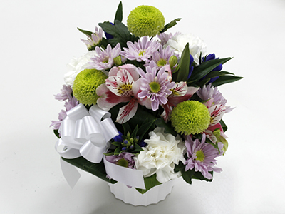 花 材:ユリ・カーネーション・スプレーマム・ピンポンマム・トルコキキョウ・グリーン 他
