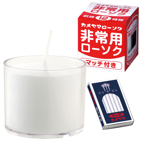 暗闇でも安心の丈夫なカップ入りのローソクです。いつ起こるかわからない天災に備え、非常用持ち出し袋に入れておくのにピッタリです。便利なマッチ付きで、燃焼時間は約12時間です。