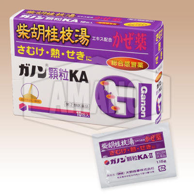 【商品説明:】くしゃみ、鼻水、発熱、頭痛など、かぜの症状がではじめたら、こじらせる前にできるだけ早く治すことが大切です。ガノン顆粒KAは、漢方処方(生薬)の柴胡桂枝湯エキスと解熱鎮痛剤、抗ヒスタミン剤、鎮咳剤、去痰剤などを効果的に配合した顆粒状のかぜ薬で、かぜの諸症状をやわらげ、健康な体への回復をたすけます。【用法用量:】下記の量を1日3回食後なるべく30分以内服用してください。○15才以上・・・1回量1包、1日服用回数3回食後○11才以上15才未満・・・1回量2/3包、1日服用回数3回食後○7才以上11才未満・・・1回量1/2包、1日服用回数3回食後○3才以上7才未満・・・1回量1/3包、1日服用回数3回食後○1才以上3才未満・・・1回量1/4包、1日服用回数3回食後○1才未満の乳児・・・服用しないでください。【内容量:】10包【製造販売元:】天野商事(株)