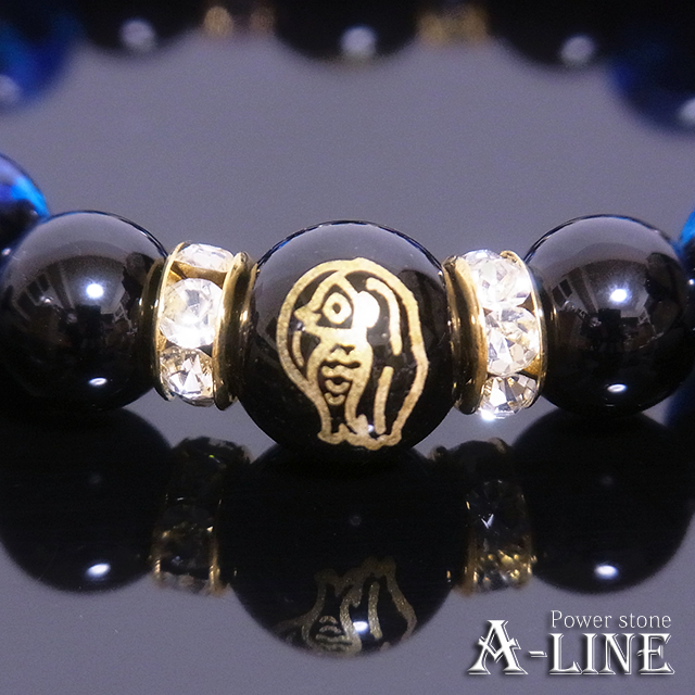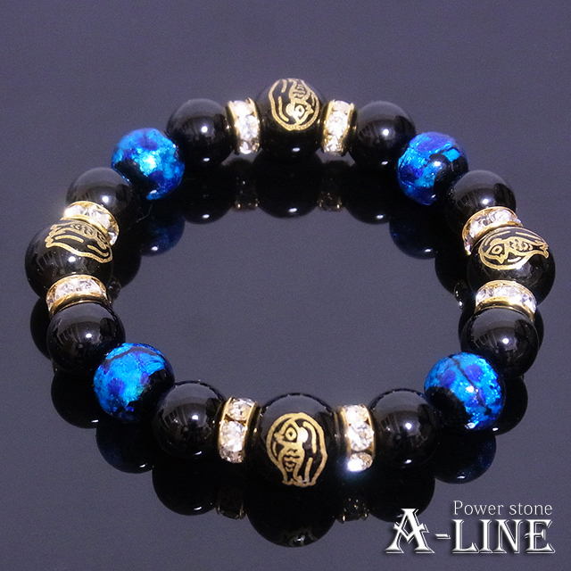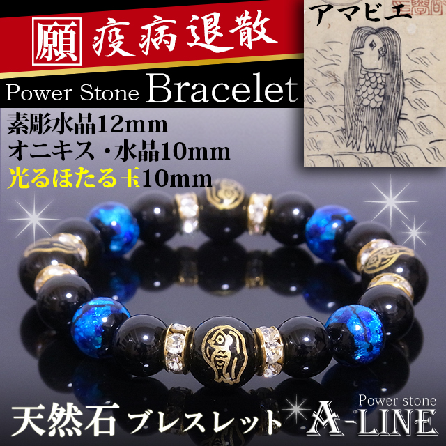 パワーストーン ブレスレット 疫病退散 東西南北にアマビエ金彫オニキス12mm ほたる玉(光る)&オニキス10mm PW-3415