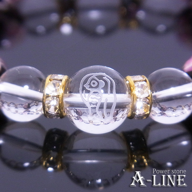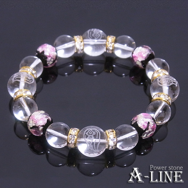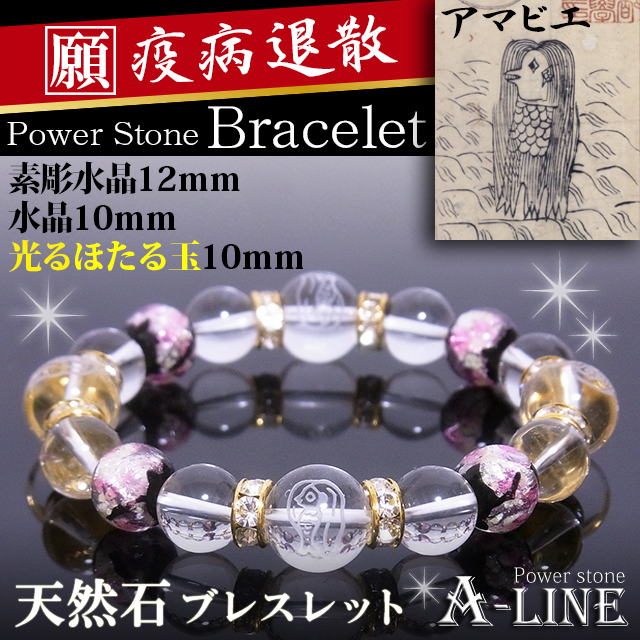 パワーストーン ブレスレット 疫病退散 東西南北にアマビエ素彫水晶12mm ほたる玉(光る)ピンク&水晶10mm PW-3416