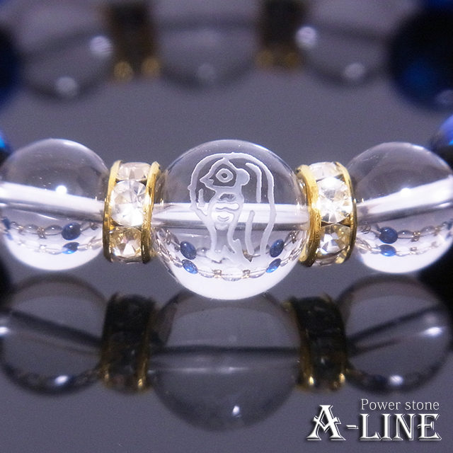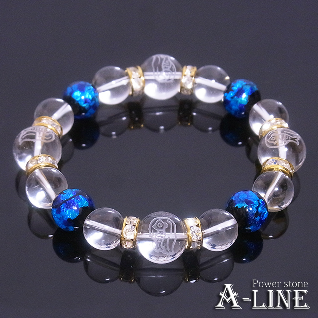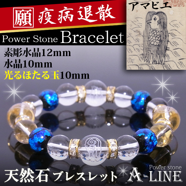 パワーストーン ブレスレット 疫病退散 東西南北にアマビエ素彫水晶12mm ほたる玉(光る)ブルー&水晶10mm PW-3417