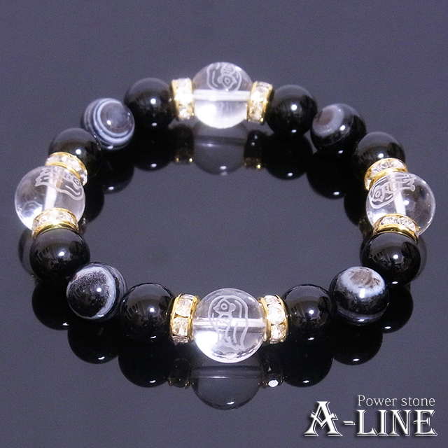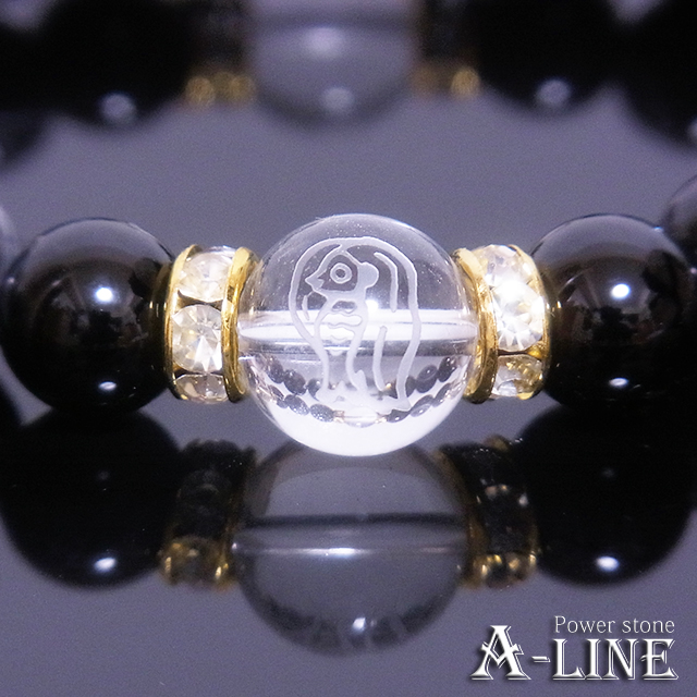 パワーストーン ブレスレット 疫病退散 東西南北にアマビエ素彫水晶12mm&天眼石&オニキス10mm PW-3418