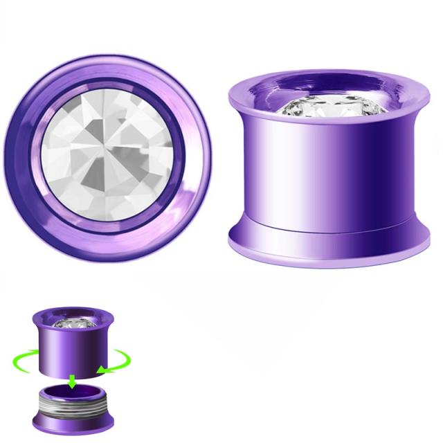 ネジ式になった両側が広がったダブルフレアにクリスタルのキュービックジルコニアをセットした紫色の綺麗なプラグ型ボディピアス。