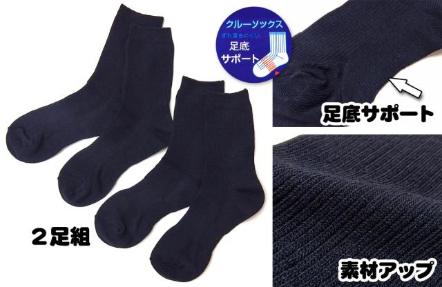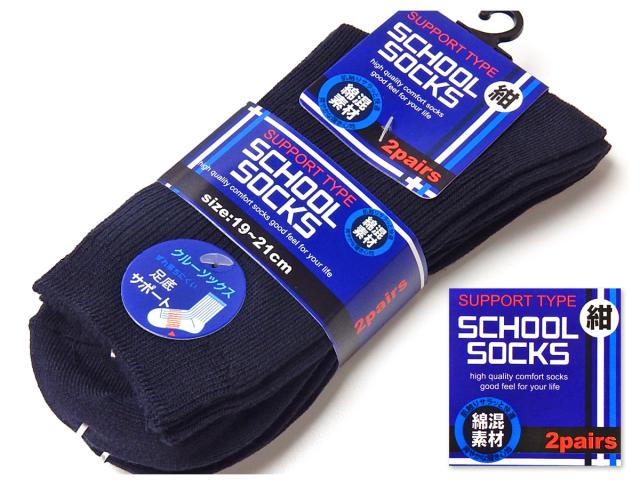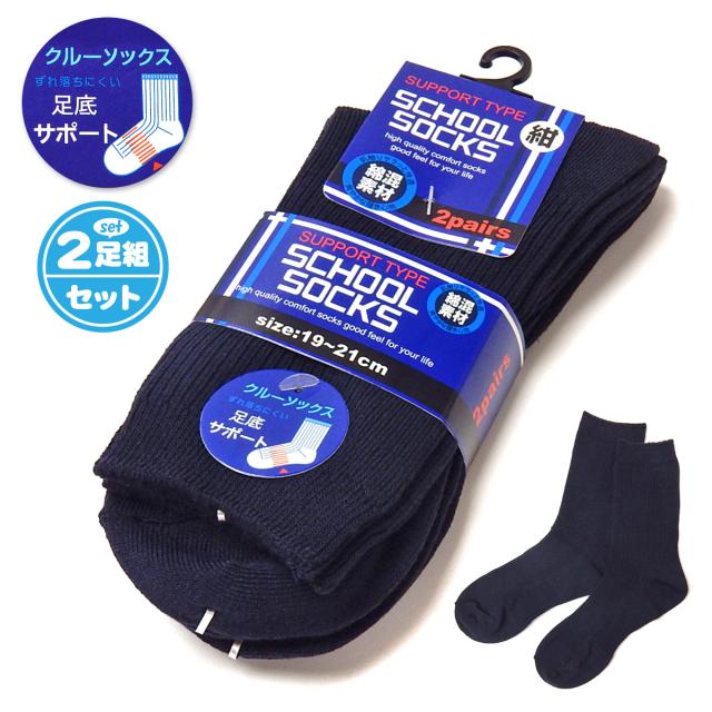 【送料無料】男児 女児 ジュニア 2足組 クルー丈 スクールソックス 紺 ずれ落ちにくい足底サポート 綿混 無地 リブ 靴下 19-21cm a-2465【メール便対応】