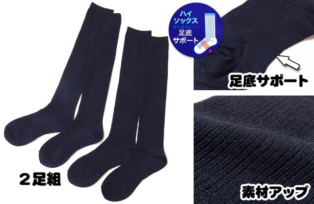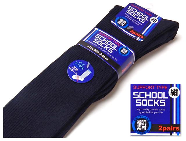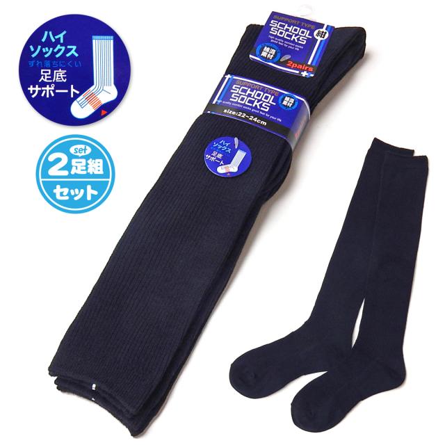 【送料無料】男児 女児 ジュニア 2足組 スクールハイソックス 紺 ずれ落ちにくい足底サポート 綿混 無地 リブ 靴下 22-24cm a-2445【メール便対応】