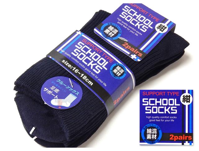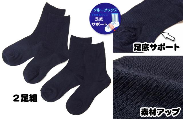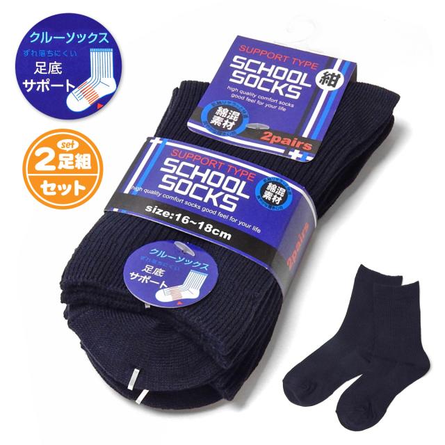 【送料無料】男児 女児 キッズ 2足組 クルー丈 スクールソックス 紺 ずれ落ちにくい足底サポート 綿混 無地 リブ 靴下 16-18cm a-2464【メール便対応】