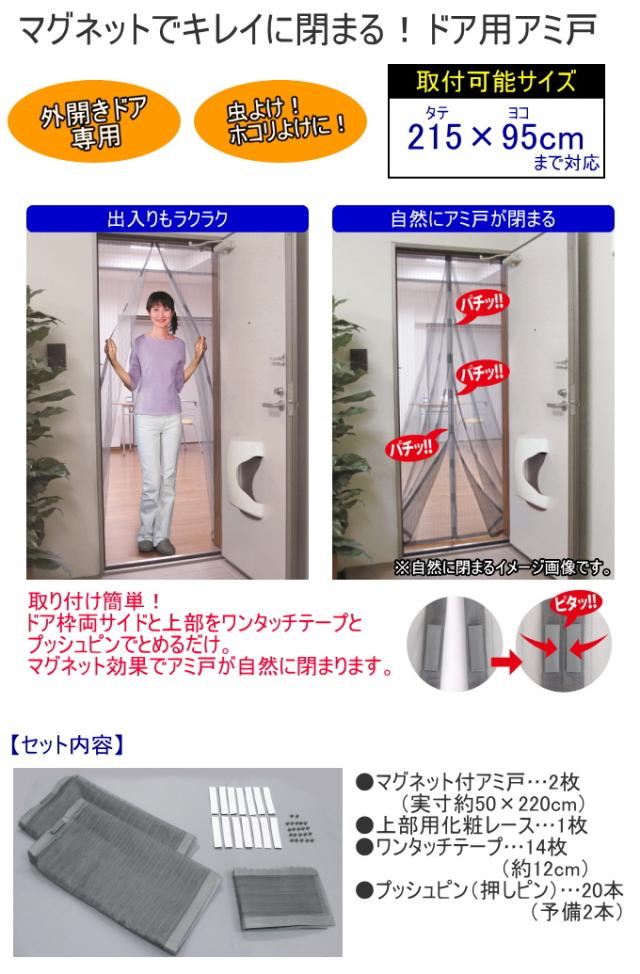 | 特徴 | ワンタッチテープとプッシュピンでとめる玄関用アミ戸(マグネット付)です。 マグネット効果でアミ戸が自然に閉まります。 取り付け簡単!取り外し可能! 虫よけ、ホコリよけにも◎。 ※外開きドア専用。 |