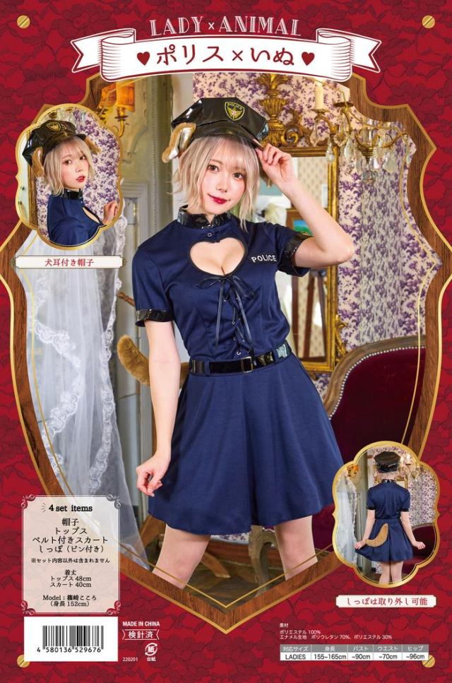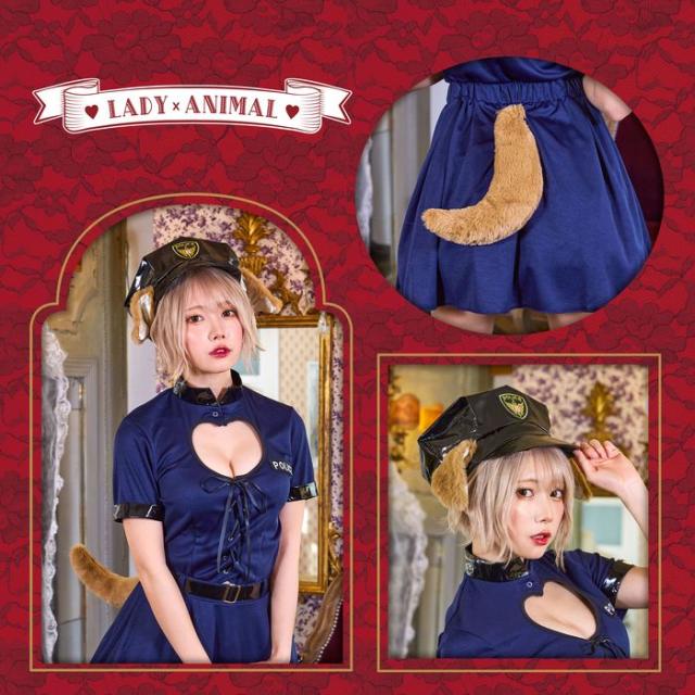 ポリス×いぬが可愛い!「レディアニマル」シリーズ。犬のおまわりさんをイメージしたポリスハットにはふわふわファーのワイヤー入りけもみみ付き。トップスは身体にフィットするストレッチ素材で、バストが綺麗に見えるハート型の胸元開きデザイン。ところどころに使用したエナメルやレースアップのウエストでセクシーな印象に。スカートはエナメルのベルト付きで、着やすいウエストゴムタイプ。しっぽはピン付きで取り外せる為、小物単品でもお使いいただけます。