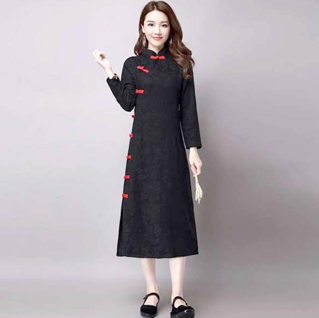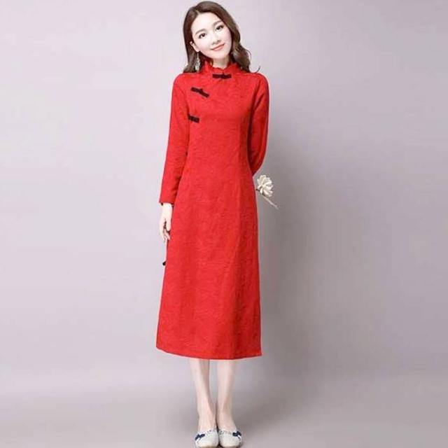 中華民族服 マキシワンピース 綿麻ワンピース ロング丈チャイナドレス 長袖