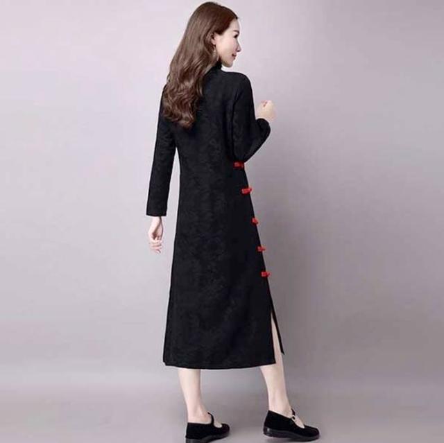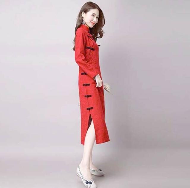 中華民族服 マキシ ワンピース 綿麻ワンピース ロング丈チャイナドレス 長袖
