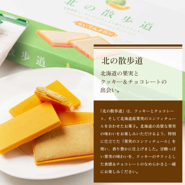 | 商品説明 | 「北の散歩道」は、とろ〜りとしたコンフィチュールとチョコレート、サクサクのクッキーで”北海道の果物を楽しむ”がコンセプトのお菓子。 北海道メロンの美味しさを存分にお楽しみいただけるように、数あるブランドの中から「JAきょうわ」の「らいでんメロン」を選びました。 「らいでんメロン」は北海道の西、ニセコ連峰の麓にある、品質の高いメロンづくりへの取り組みが盛んな地域で生産されています。澄んだ空気と肥沃な大地の恩恵を受け、肉厚でとろけるような口どけと味わい、芳醇な香りと甘みたっぷりに育ちます。 凝縮した北海道メロンの味わいを、「北の散歩道 らいでんメロン」でぜひお楽しみください。 |