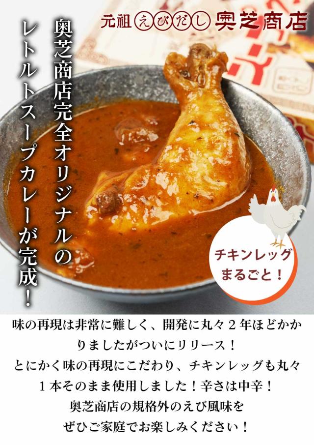 | 商品説明 | 奥芝商店完全オリジナルのレトルトスープカレーが完成しました! レトルト商品での、味の再現は非常に難しく、開発に丸々2年ほどかかりましたがついにリリース! とにかく味の再現にこだわり、チキンレッグも丸々1本そのまま使用しました! 辛さは中辛! 奥芝商店の規格外のえび風味をぜひご家庭でお楽しみください! |