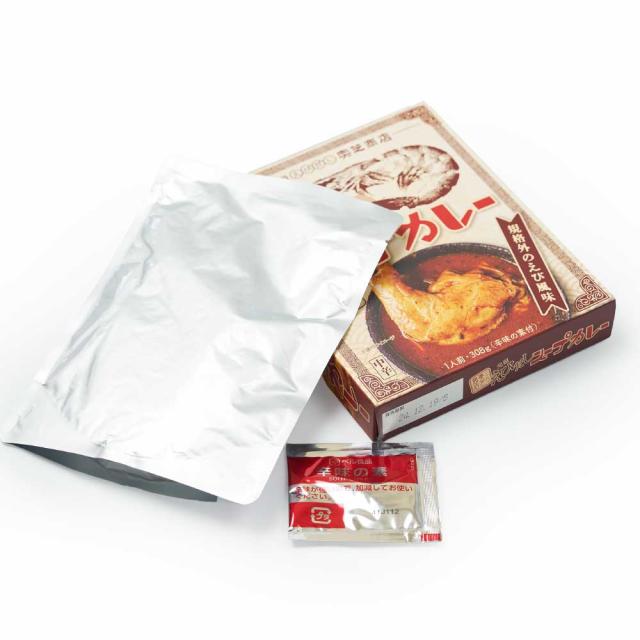 | 原材料名 | 【スープカレー】骨付鶏肉(輸入)、アメリカンソース、オニオンソテー、しょうゆ、トマトペースト、ポークエキス、香味油、香辛料、砂糖、えびパウダー、にんにくペースト、かにエキス、たんぱく加水分解物、食塩、かつお風味調味料/増粘剤(加工デンプン)、調味料(アミノ酸等)、香料、(一部に乳成分・小麦・えび・かに・大豆・鶏肉・豚肉を含む) 【辛みの素】水あめ、唐辛子、食塩/酒精、酸味料、調味料(有機酸)、増粘剤(キサンタン)、パプリカ色素 |