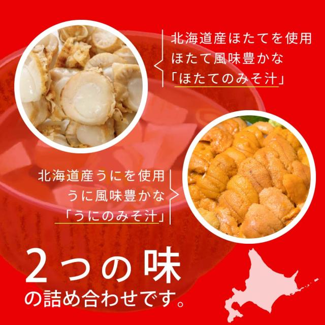 | 商品説明 | 北海道産うにを使ったうに風味豊かな「うにのみそ汁」と、北海道産ほたてを使ったほたて風味豊かな「ほたてのみそ汁」2つの味の詰合せです。あつあつのお湯を注いでお楽しみください。 |