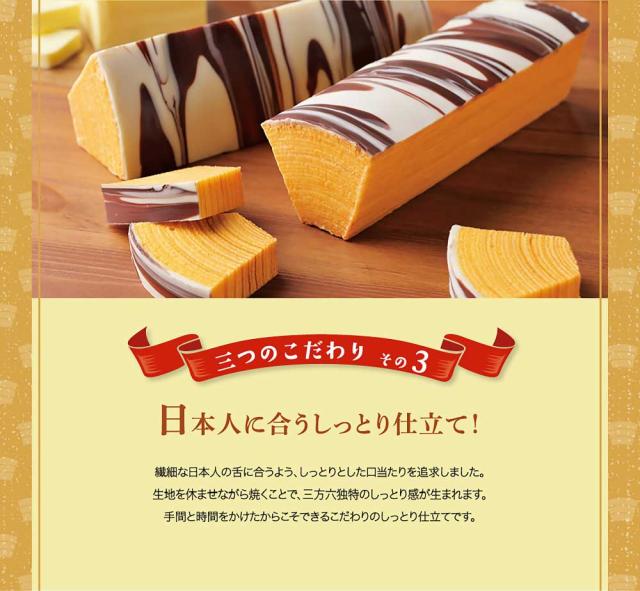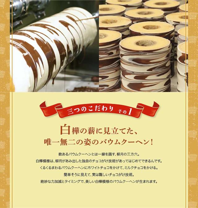 | 商品名称 | 「柳月」人気No.1の代表銘菓! 「白樺の木肌」をミルクチョコレートとホワイトチョコレートで表現しました。 十勝産100%の小麦粉を使用したこだわりの味わい。 旨みをぎゅっと閉じ込める独自の製法は「しっとり系バウムクーヘン」の最高峰と噂されるほどの評判で、本州方面からの取寄依頼や有名人のファンも多いロングセラー商品です。 |