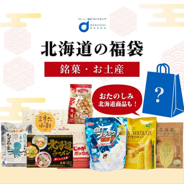 | 商品説明 | 北海道の有名銘菓・お土産を9点を詰め合わせたギフトセットです。 ・丸市岡田商店オリジナル商品 × 1点 ・北海道ラーメン 生麺3食入(函館しお/札幌みそ/旭川しょうゆ) × 1点 ・店長セレクト北海道商品 × 1点 ・HORI:とうきびチョコレートシリーズいずれか × 1点 ・有楽製菓:(北海道限定)白いブラックサンダー10袋入り × 1点 ・北海道ダイニングキッチン:北海道スープいずれか × 1点 ・花畑牧場:ポップコーンシリーズいずれか × 1点 ・柳月:鮭ぶし丸もしくは三方六のいずれか × 1点 ・ポテトファーム(カルビー):じゃがポックル(6袋入) × 1点 |
