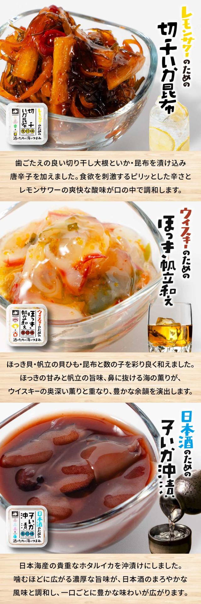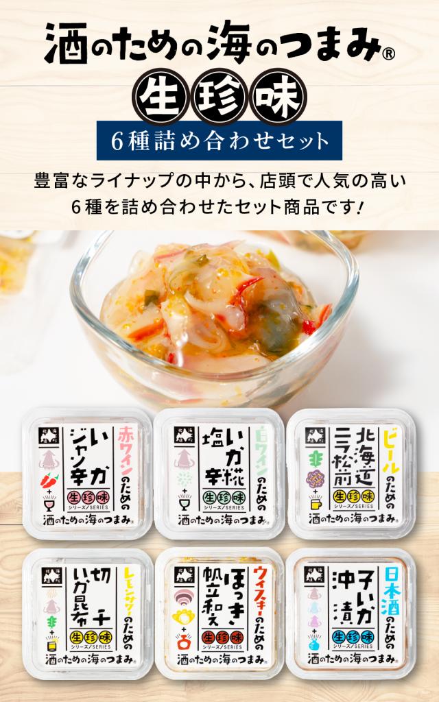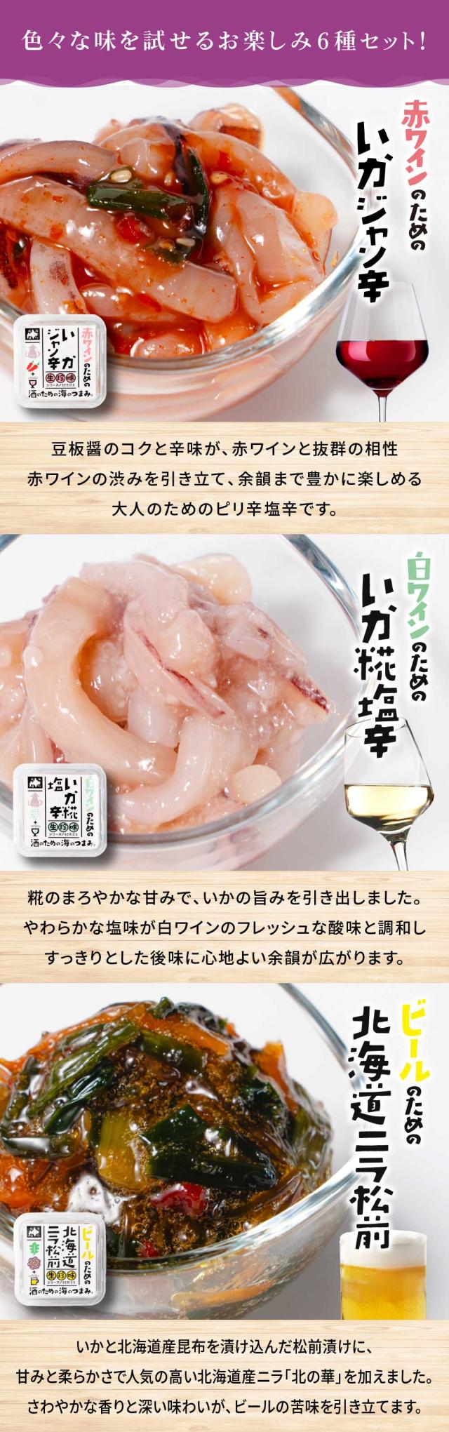 | 内容量 | 酒のための海のつまみ 生珍味 6種セット ・白ワインのためのいか糀塩辛 50g ・赤ワインのためのいかジャン辛 50g ・ウイスキーのためのほっき帆立和え 50g ・レモンサワーのための切干いか昆布 50g ・ビールのための北海道ニラ松前 50g ・日本酒のための子いか沖漬け 50g |